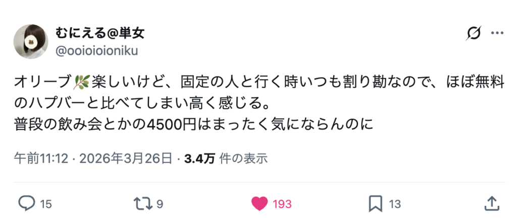 オリーブ楽しいけど、固定の人と行く時いつも割り勘なので、ほぼ無料のハプバーと比べてしまい高く感じる。普段の飲み会とかの4500円はまったく気にならんのに